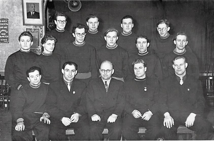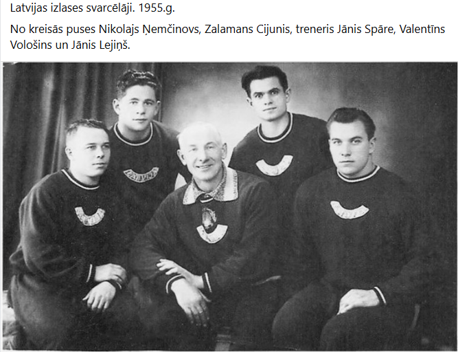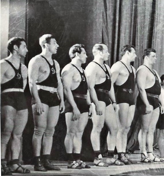 Latvijas svarcelšanas izlase 1946.gadā PSRS komandu čempionātā Gorkijā.No kreisās puses A. Lapidevskis, J.Grišs, V. Iļjušins, R. Vēveris, K. Zorgenfreijs un M. Rusoņiks.
