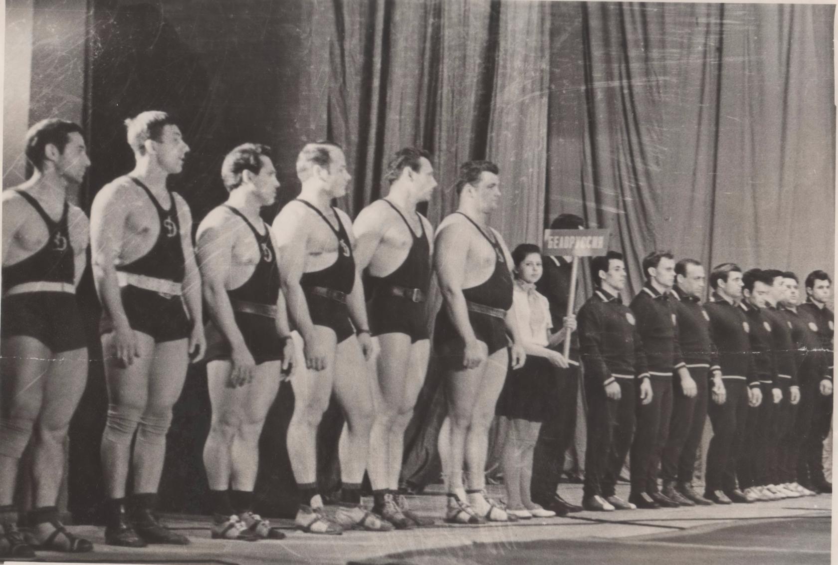1968.g. Vitebska. Starptautiskās komandu mačsacīkstes. Baltkrievija-Čehoslovākija-Polija-Latvija.Foto. Daļa Latvijas komandas atklāšanas parādē. No kreisās puses Jevgeņijs Abrašovs, Aleksandrs Belušs, Anatolijs Majasins, Vilis Pērkons, Guntis Kalns un Arturs Sliede.