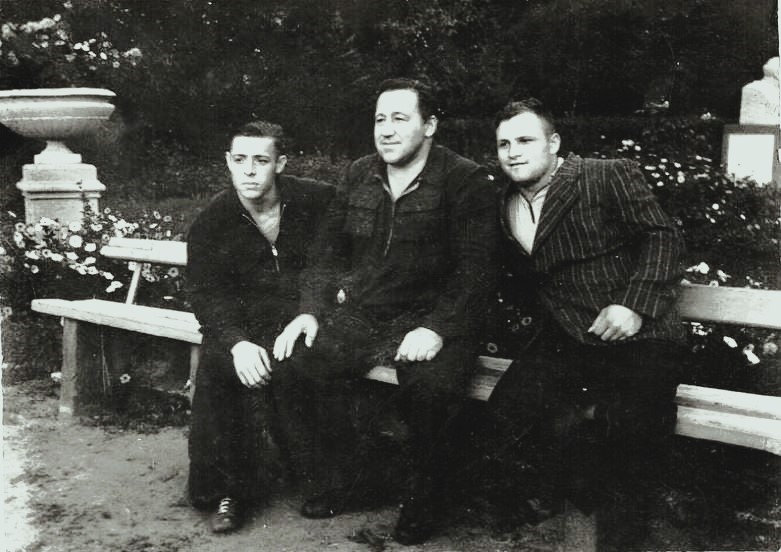 Latvijas čempioni un rekordisti svarcelšanā. No kreisās puses - Jevgeņijs Diners, Aleksandrs Lapidevskis un Vils Hoļins. 1952.g.