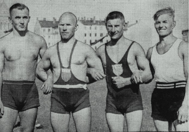 Latvijas čempioni svarcelšanā. 1939.g. No kreisās puses - J.Grišs, G.Puriševs, K.Zorgenfreijs un V.Tempelfelds.
